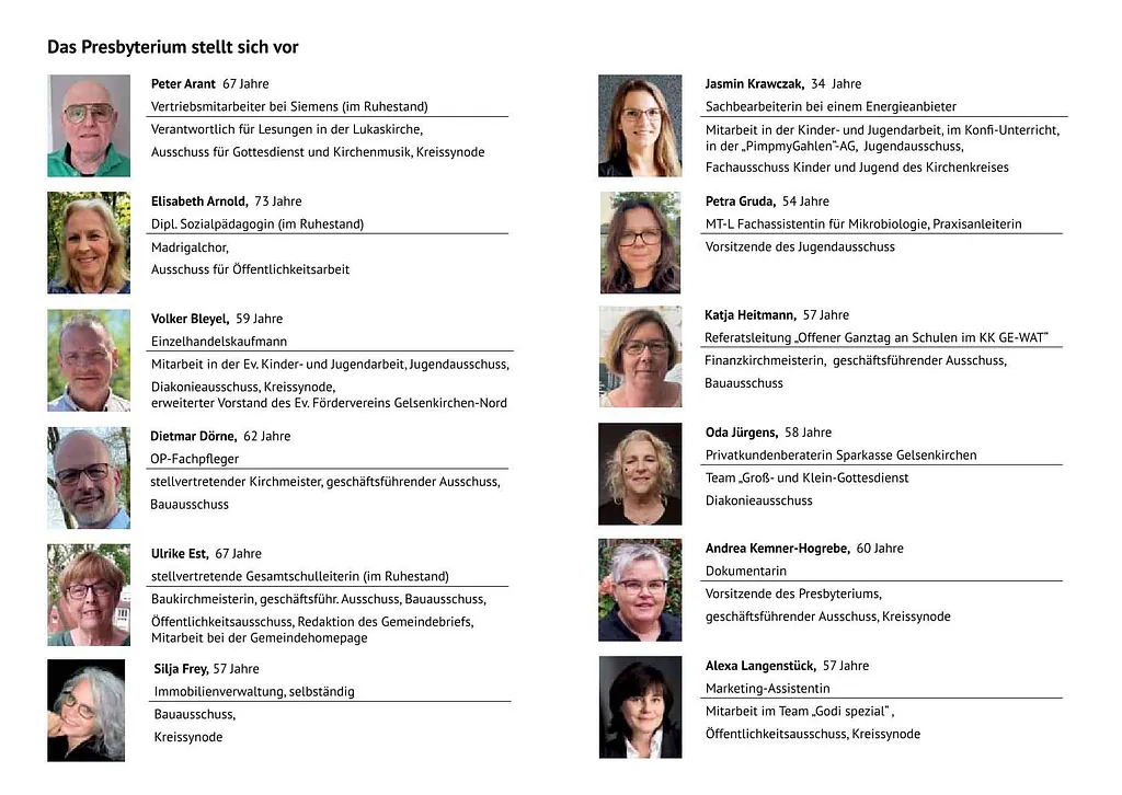 Außer den gewählten Presbyter:innen gehören die Pfarrer:innen der Gemeinde und der zugeordnete Berufsschulpfarrer Andreas Dombrowski zum Presbyterium.